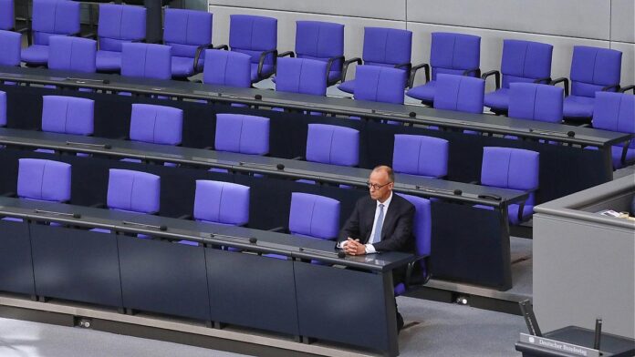 Foto: Friedrich Merz alleine auf der Regierungsbank am 06.05.2025, via dts Nachrichtenagentur